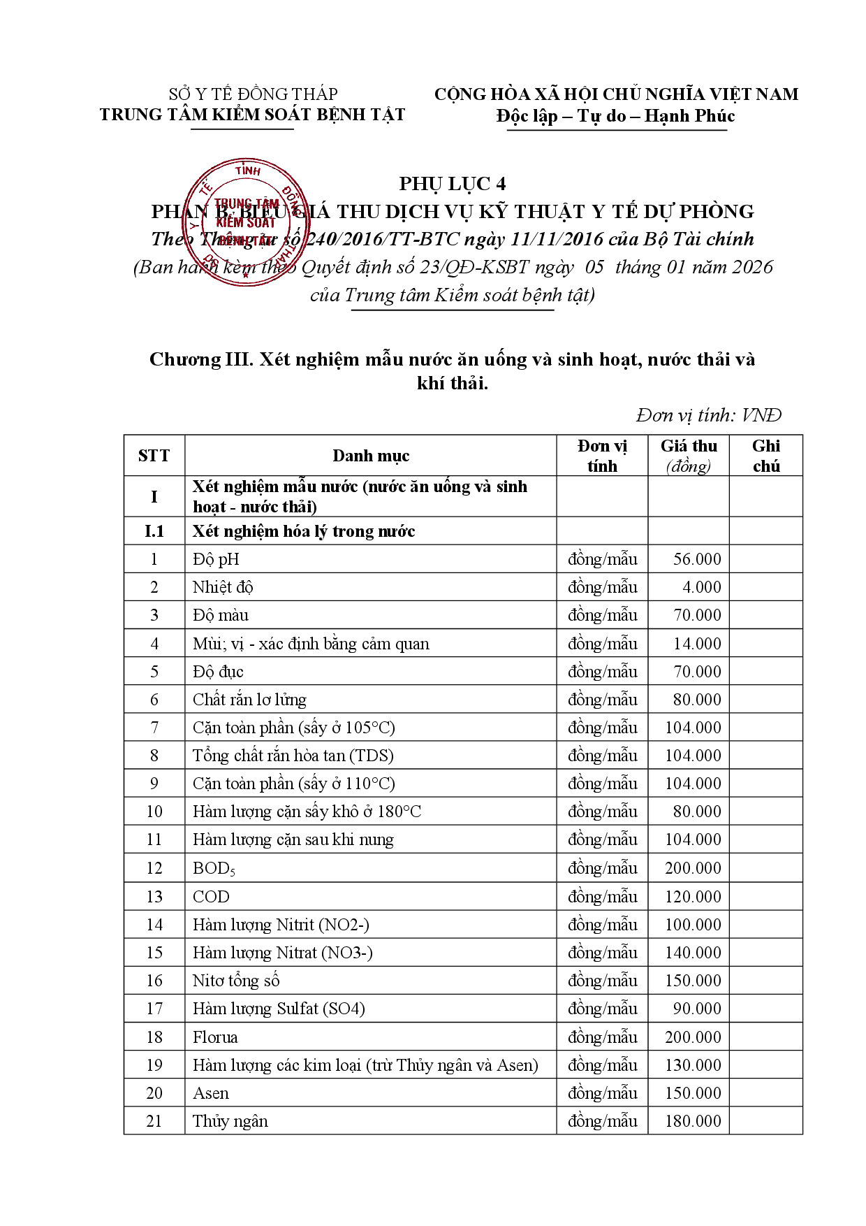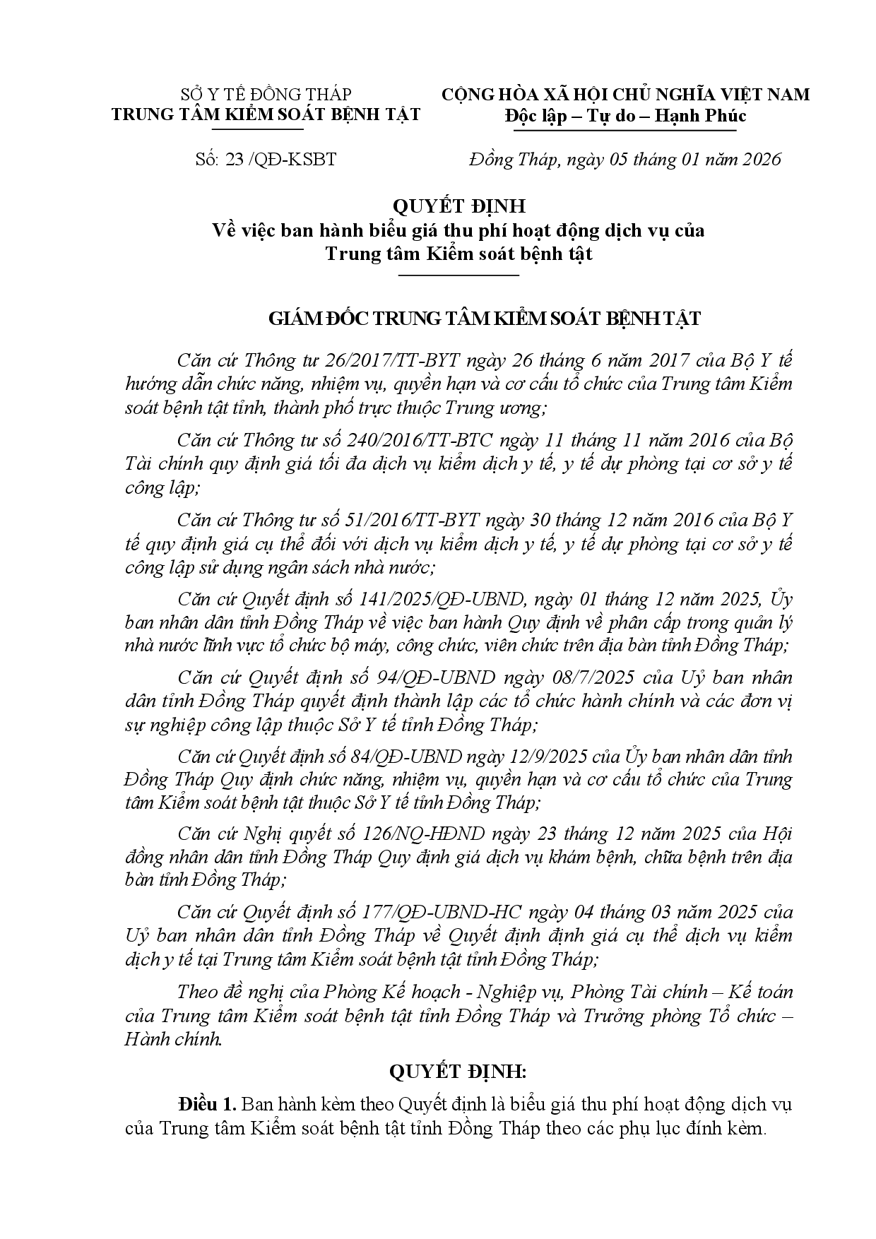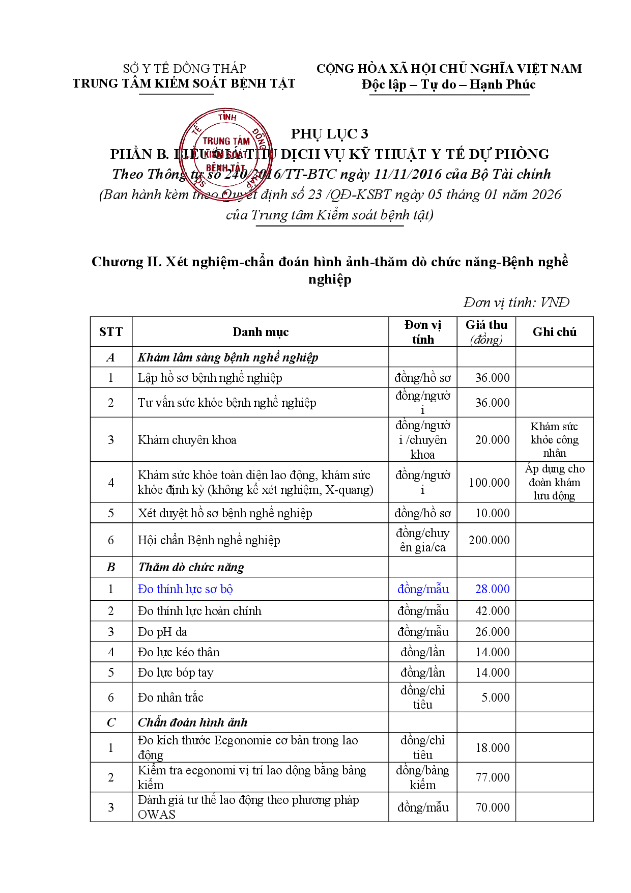 Quyết định về việc ban hành cập nhật, bổ sung, điều chỉnh biểu giá thu phí hoạt động dịch vụ của Trung tâm Kiểm soát bệnh tật tỉnh Đồng Tháp Cập nhật, bổ sung, điều chỉnh biểu giá thu phí hoạt động dịch vụ của Trung tâm Kiểm soát bệnh tật tỉnh Đồng Tháp