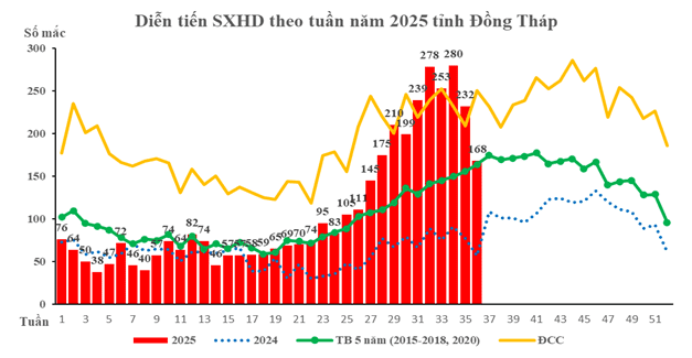 Tính từ ngày 01/9/2025 đến ngày 07/9/2025 (tuần 36), trên địa bàn tỉnh Đồng Tháp ghi nhận 168 trường hợp mắc bệnh Sốt xuất huyết Dengue (SXHD), giảm 27,9% so với tuần trước (233 ca). Tổng số ca SXHD tích lũy từ đầu năm 2025 đến tuần 36 là 3.924 ca, so với cùng kỳ năm 2024 (2.147 ca) tăng 82,8%. Địa phương có nguy cơ gồm: Gia Thuận, Mỹ Tịnh An, Bình Hàng Trung, Mỹ Hiệp, Tân Đông, P. Thường Lạc, Mỹ Thọ, An Thạnh Thủy, Chợ Gạo, Tân Thuận Bình.