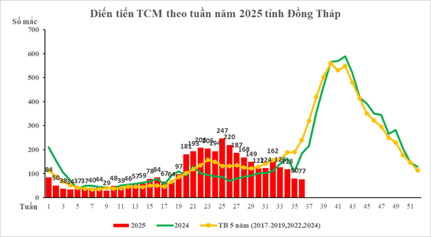 Trong tuần 36, tỉnh Đồng Tháp cũng ghi nhận 77 trường hợp mắc bệnh Tay chân miệng (TCM), giảm 3,8% so với tuần trước. Tổng số ca TCM tích lũy từ đầu năm 2025 đến tuần 36 là 3.808 ca, so với cùng kỳ năm 2024 (3.256 ca) tăng 17,0%. Địa phương có nguy cơ gồm: Tân Phước 2, Tam Nông, Phú Cường, Long Bình, Long Phú Thuận, P. Nhị Quý.