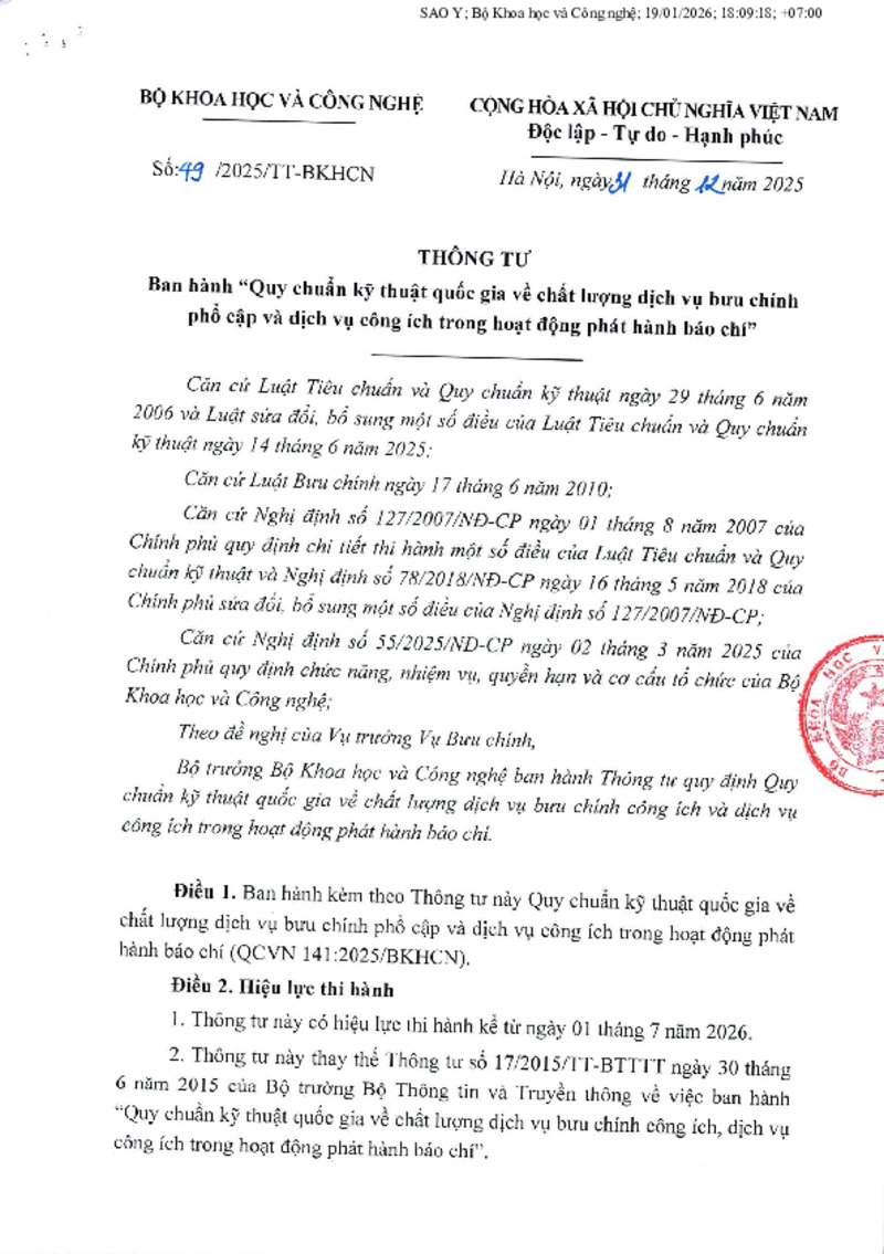 | Tiêu đề văn bản | Ban hành “Quy chuẩn kỹ thuật quốc gia về chất lượng dịch vụ bưu chính phổ cập và dịch vụ công ích trong hoạt động phát hành báo chí” | ||