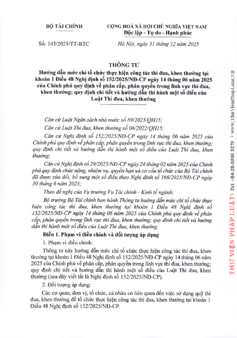 | Tiêu đề văn bản | Hướng dẫn mức chi tổ chức thực hiện công tác thi đua, khen thưởng tại khoản 1 Điều 48 Nghị định số 152/2025/NĐ-CP ngày 14 tháng 06 năm 2025 của Chính phủ quy định về phân cấp, phân quyền trong lĩnh vực thi đua, khen thưởng | ||