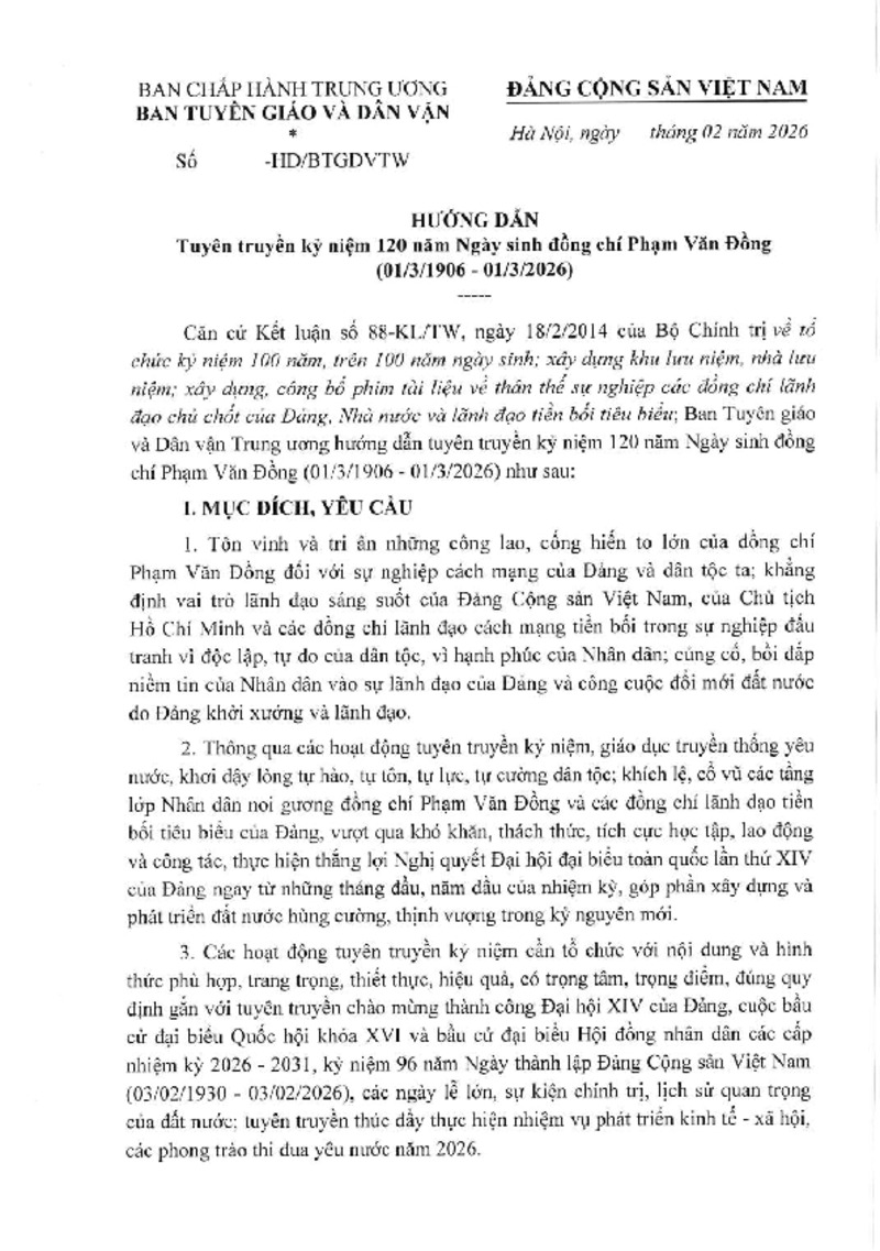 | Tiêu đề văn bản | Hướng dẫn tuyên truyền kỷ niệm 120 năm Ngày sinh đồng chí Phạm Văn Đồng (01/3/1906-01/3/2026) | ||