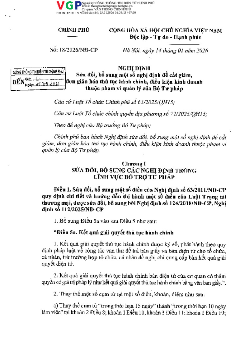 | Tiêu đề văn bản | Sửa đổi, bổ sung một số nghị định để cắt giảm, đơn giản hóa thủ tục hành chính, điều kiện kinh doanh thuộc phạm vi quản lý của Bộ Tư pháp | ||