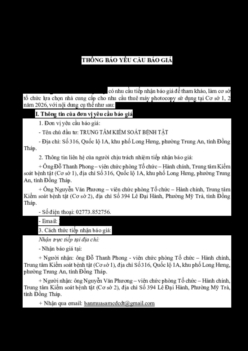 | Tiêu đề văn bản | Thông báo mời báo giá gói thuê Máy photocopy sử dụng tại cơ sở 1, cơ sở 2 năm 2026 của Trung tâm Kiểm soát bệnh tật | ||