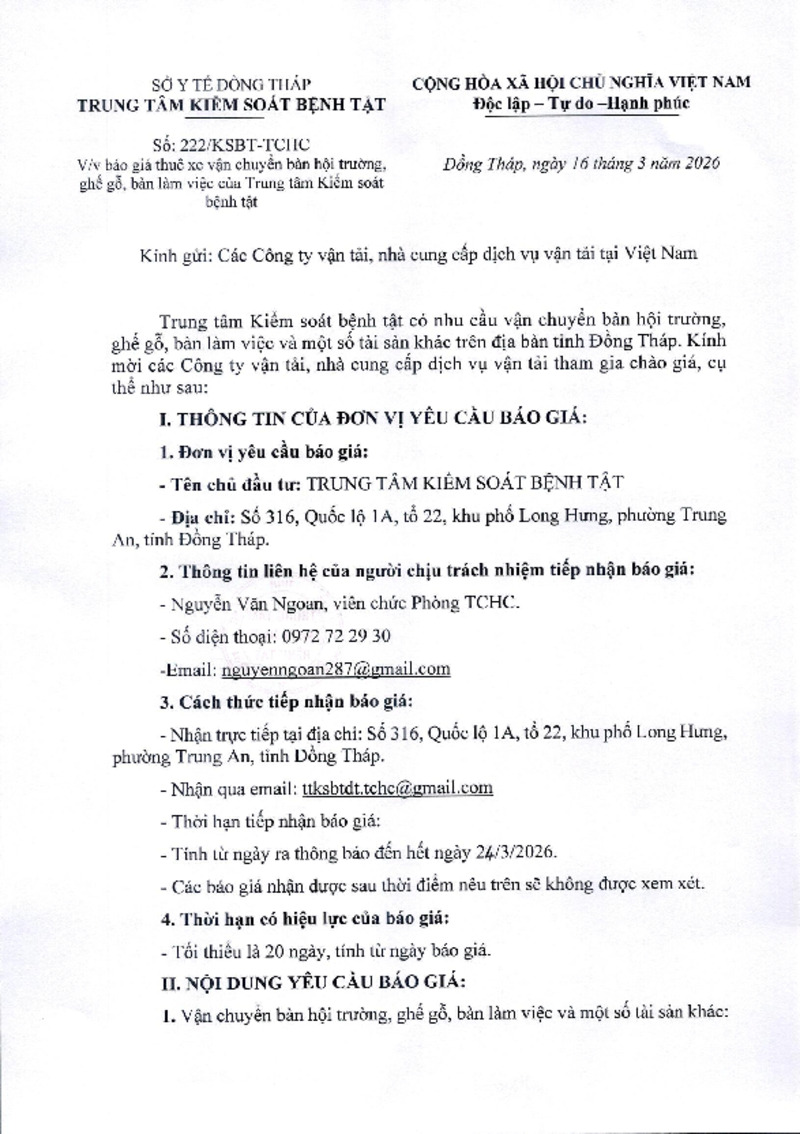 | Tiêu đề văn bản | V/v báo giá thuê xe vận chuyển bàn hội trường, ghế gỗ, bàn làm việc của Trung tâm Kiểm soát bệnh tật | ||