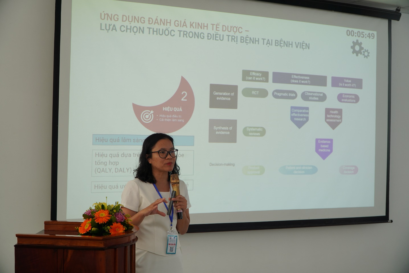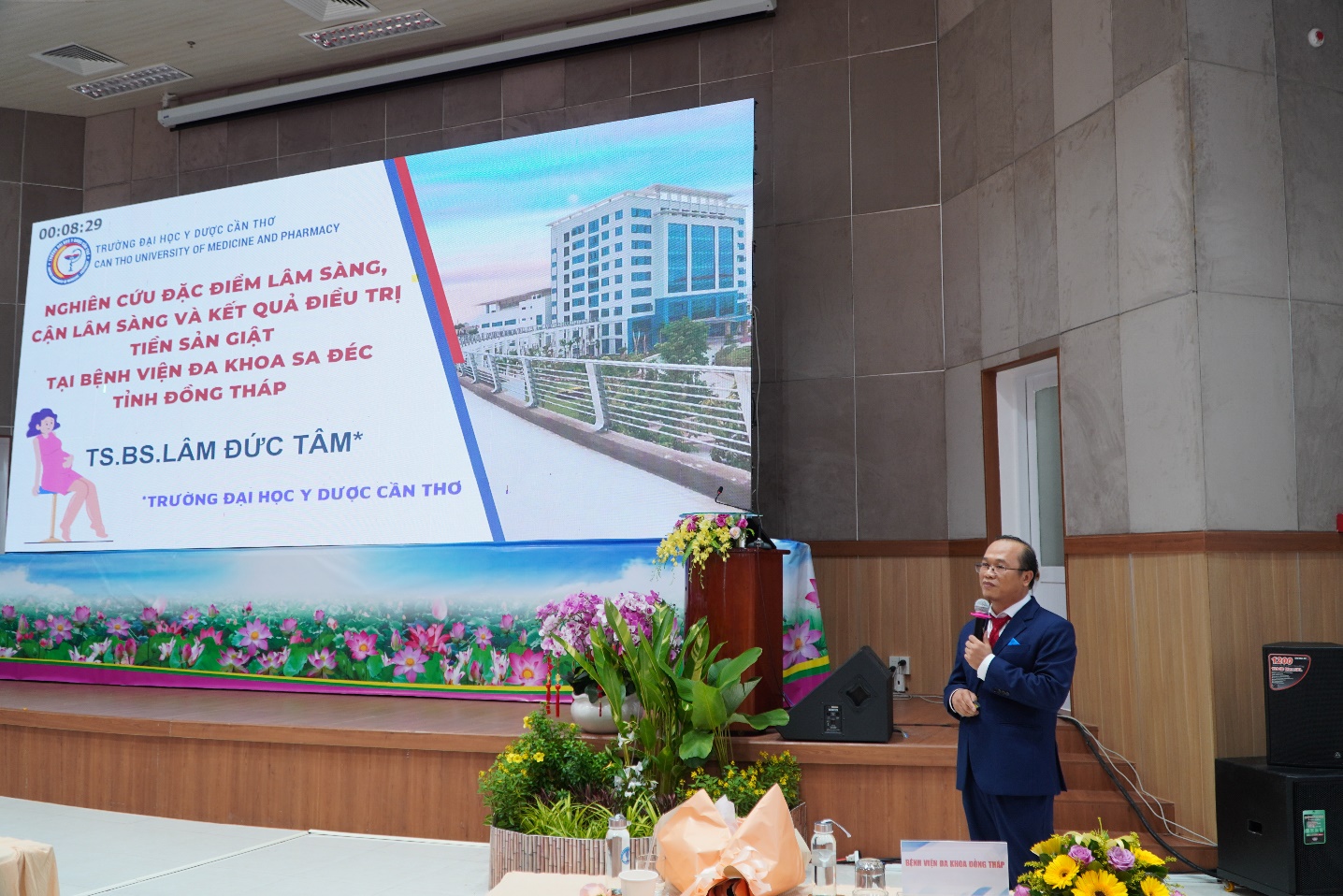 BS.CK2. Tạ Tùng Lâm, Giám đốc Bệnh viện Đa khoa Đồng Tháp (bìa trái) tặng hoa tri ân chủ tọa và báo cáo viên của Hội nghị.