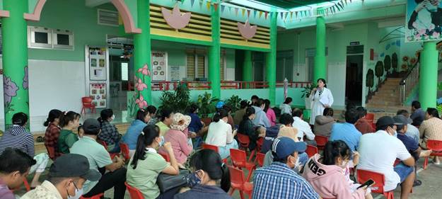 BS. Lê Thị Đẹp, Trưởng trạm Y tế xã Tân Điền truyền thông phòng, chống SXH tại trường mầm non Tân Điền