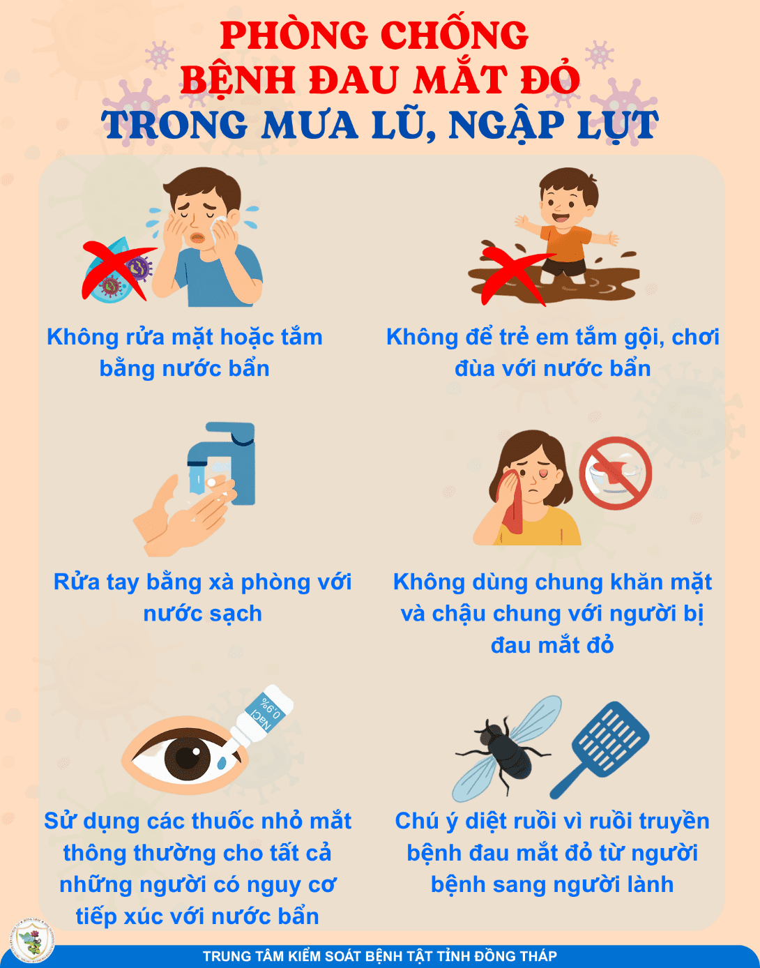 - Không rửa mặt hoặc tắm bằng nước bẩn: Tuyệt đối không dùng nước bẩn, nước bị ô nhiễm để rửa mặt, tắm gội. Hãy chủ động trữ nước sạch, nước đun sôi để nguội để sử dụng cho sinh hoạt cá nhân, đặc biệt là vệ sinh mắt.