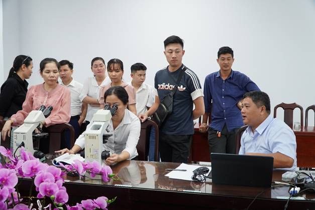 Tại lớp tập huấn, Thầy thuốc ưu tú, ThS. Nguyễn Đức Thắng, Phó Trưởng khoa Ký sinh trùng, Viện Sốt rét - Ký sinh trùng - Côn trùng TP. Hồ Chí Minh cùng đội ngũ giảng viên đã truyền đạt những nội dung: Quyết định số 1744/QĐ-BYT ngày 30/3/2021 của Bộ Y tế ban hành hướng dẫn giám sát và phòng, chống bệnh ký sinh trùng thường gặp tại Việt Nam; Quyết định số 5003/QĐ-BYT ngày 29/10/2024 của Bộ Y tế ban hành kế hoạch phân vùng dịch tễ bệnh ký sinh trùng thường gặp tại Việt Nam giai đoạn 2021 - 2025; Chia sẻ kinh nghiệm, kiến thức về đặc điểm hình thái giúp định danh nấm men, nấm da và nấm lưỡng hình; Kỹ thuật xét nghiệm phân trực tiếp phát hiện trứng giun, sán, ấu trùng giun, đơn bào; Kỹ thuật xét nghiệm Kato - Kazt phát hiện trứng giun, sán; Kỹ thuật lấy mẫu nấm ngoài da (lông, tóc, móng); Kỹ thuật ELISA chẩn đoán bệnh ký sinh trùng; Kỹ thuật làm tiêu bản (giun, sán, nấm, đơn); Thực hành soi tiêu bản mẫu (giun, sán, nấm, đơn).